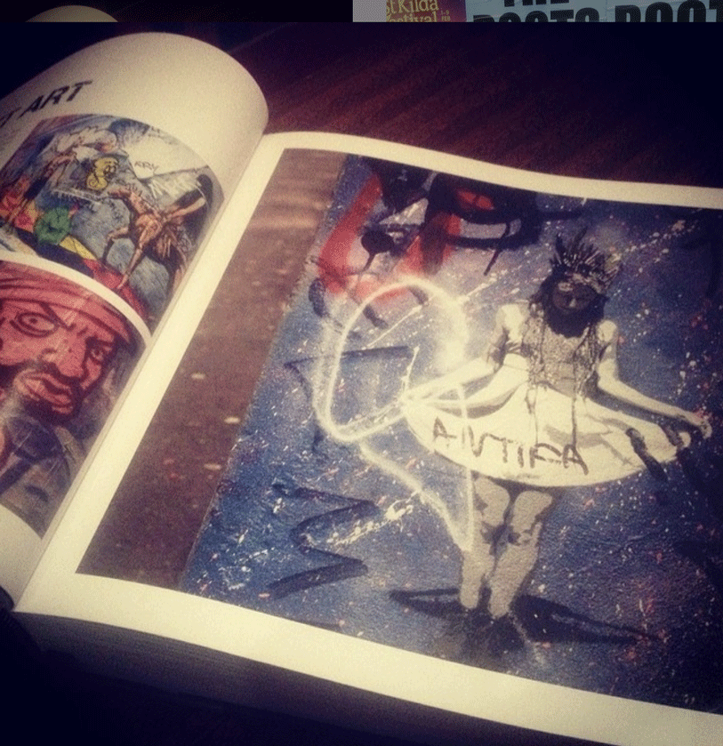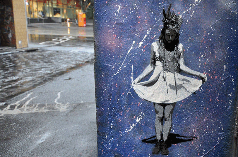 A 5 layer stencil on a speckled blue background in Hosier Lane. Later found in a published book showcasing Melbourne street art.